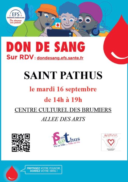 Le mardi 16 septembre 2025, l’E.F.S. (l’Etablissement Français du Sang) organise sur la commune de Saint-Pathus, une nouvelle collecte au Centre Culturel des Brumiers (AllĂ©e des Arts) entre 14h et 19h.