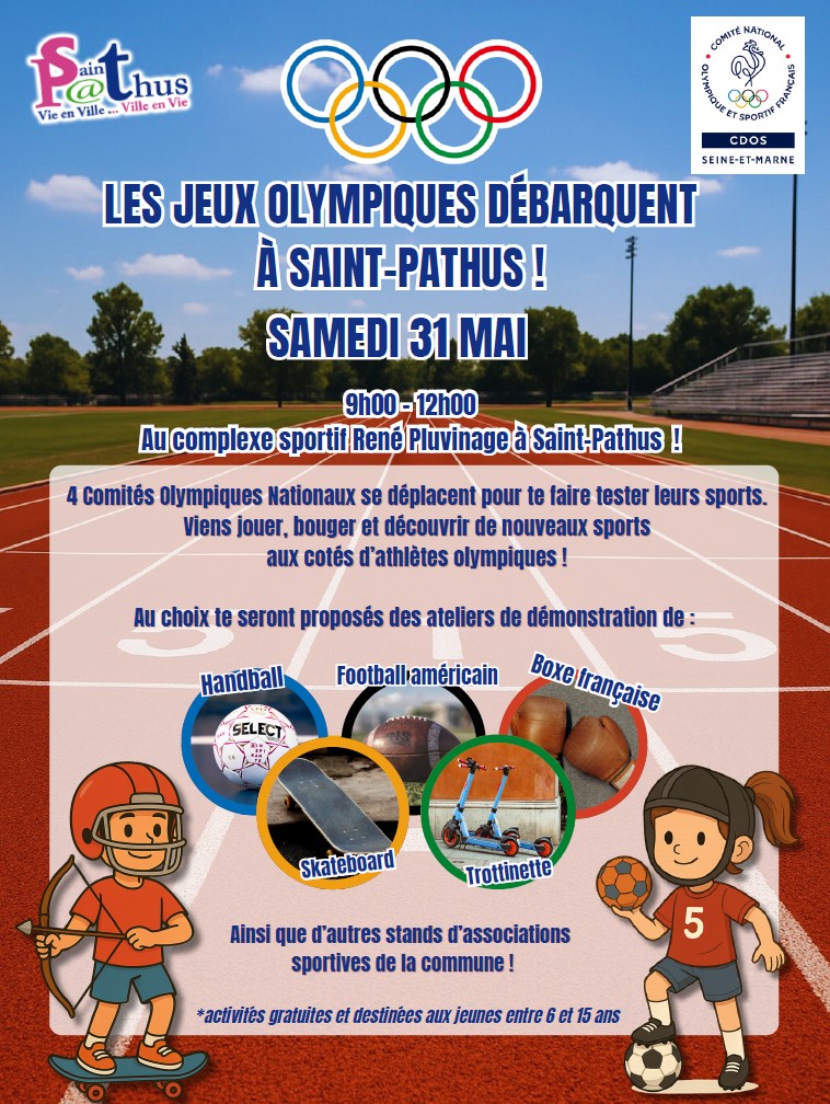 Grâce à une collaboration inédite entre le CDOS et la Ville de Saint-Pathus, viens vivre une expérience unique aux couleurs des Jeux Olympiques, en présence d’athlètes olympiques et de 4 Comités Olympiques Nationaux !